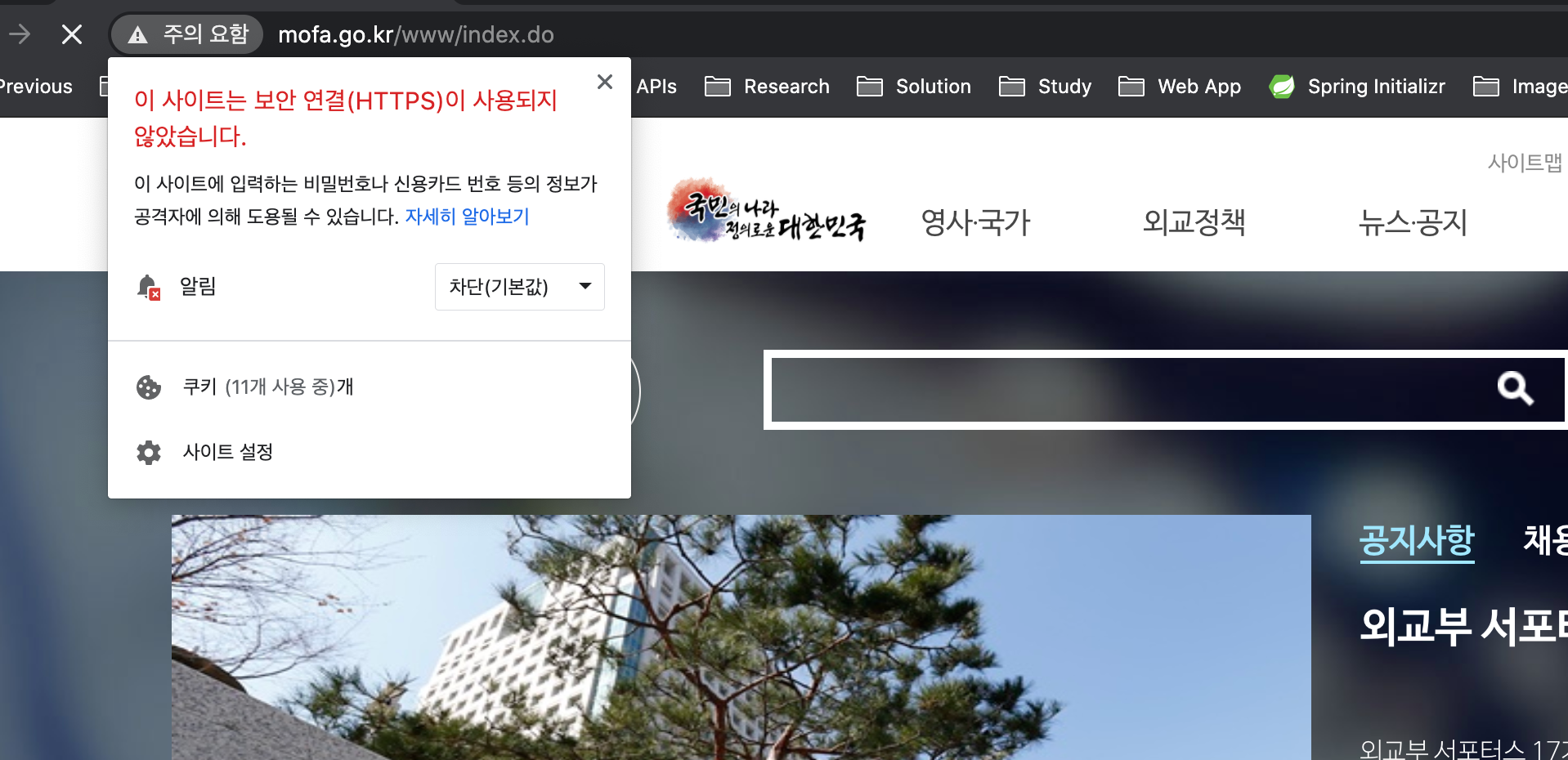 다만 외교부 도메인에 대해서 SSL 적용이 안되어있습니다. 심각한 문제로 보여집니다.