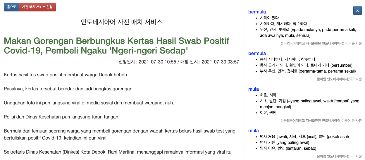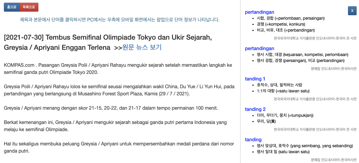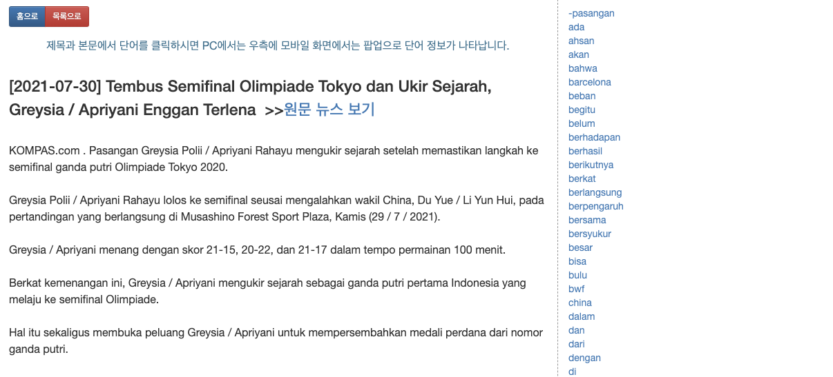 노출된 기사들의 제목을 클릭하시면 인도네시아어 사전 매치 서비스와 거의 동일한 화면이 나타납니다.