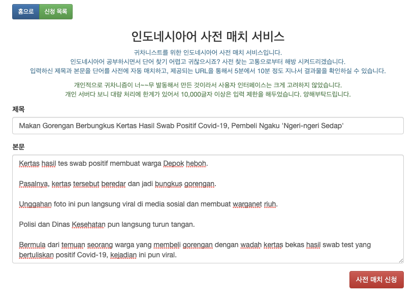 인도네시아어 사전 매칭 서비스와 뉴스기사로 인니어 공부하기 서비스는 제가 인니어 공부하면서 사전 찾기 귀찮아서 만든 기능입니다.