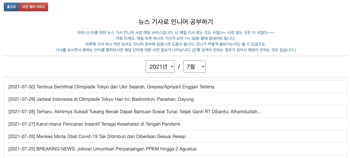 2021.07.11 - [인도네시아/인도네시아어] - 뉴스 기사로 인니어 공부하기 - 웹사이트 - 해당 페이지에 접속하시면 해당 월의 기사들이 노출 됩니다. 년도와 월을 선택해서 지난 기사들도 찾아보실 수 있습니다.