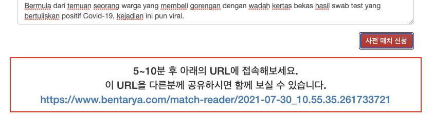 매치신청 이후에 나타나는 링크 화면 - 너무 빨리 해당 사이트에 접속하시면 결과를 볼 수 없구요. 새로 고침 하시면서 기다리셔야 합니다.