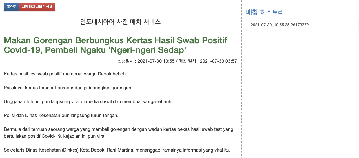 노출된 기사들의 제목을 클릭하시면 인도네시아어 사전 매치 서비스와 거의 동일한 화면이 나타납니다.