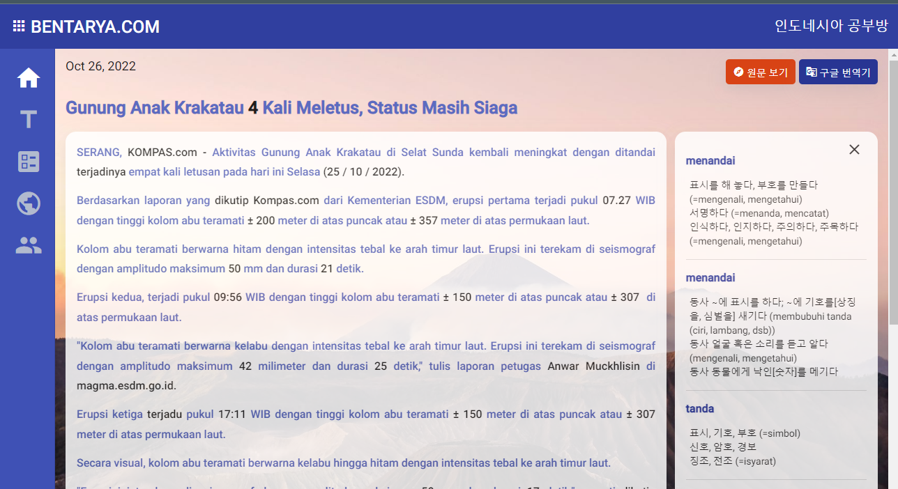 인니어 공부할 때 신문기사를 주로 읽어왔습니다. 사전을 하나 하나 찾아가면서 공부하다가 너무 너무 귀찮아서...