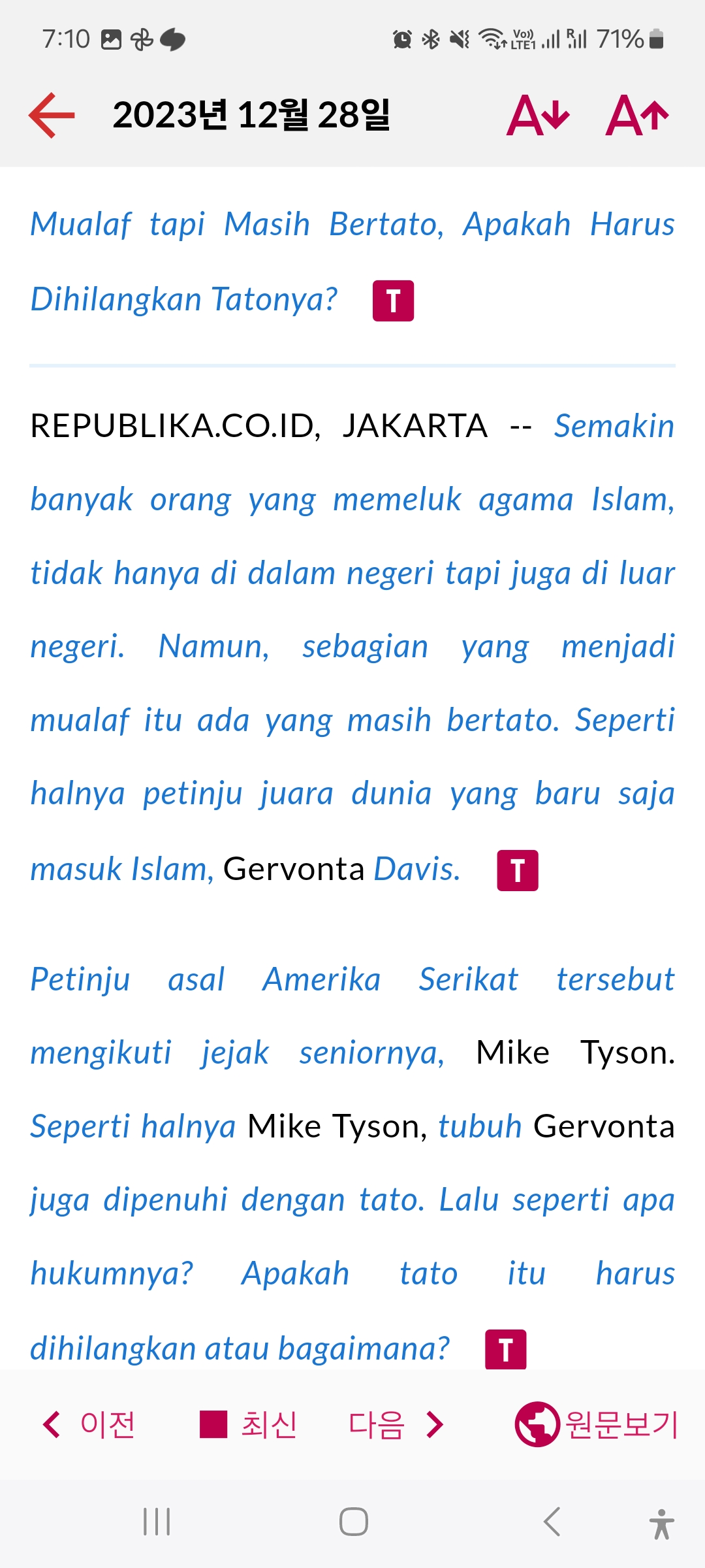 3) 바하사 인도네시아 (기사 읽기)![]() 기사 내용중 파란색 단어들은 사전 매칭이 된 단어들이어서 터치 하면 단어 상세 정보를 4)번 화면 처럼 보여드립니다. 화면 상단에 글씨 크기를 키우고 줄이실 수 있어서 사용자의 시력에 맞춰 보실 수 있도록 해두었습니다. 화면 하단에는 기사간의 이동 또는 원문 기사를보실 수 있는 링크를 제공합니다. |